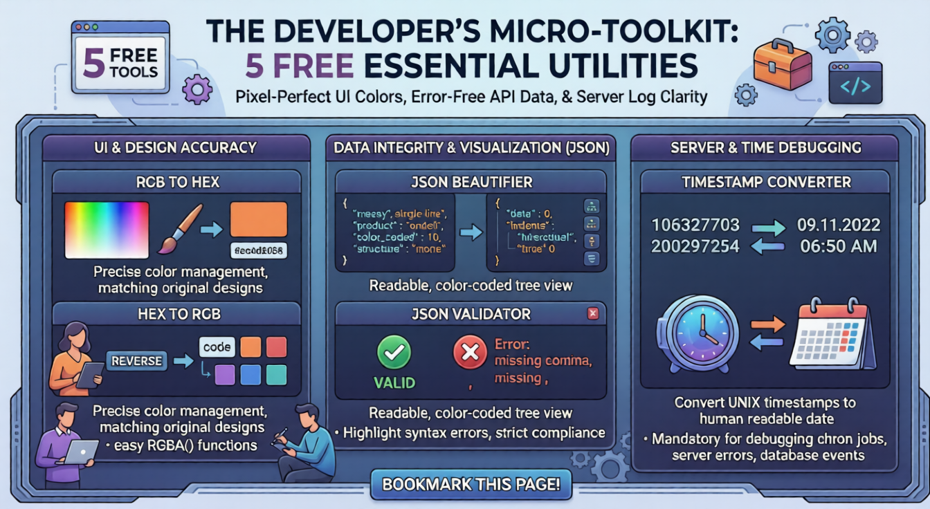 These 5 micro-utilities may seem simple, but they are the tools developers reach for multiple times a day. By using these free, browser-based utilities, you can ensure your UI colors are pixel-perfect, your API data is error-free, and your server logs actually make sense.